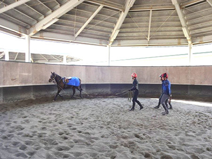 | 平成26年10月24日(金) 馴致実習 こんにちは!北海道は寒くてもうやっていけません、、、というのは冗談ですがほんとに寒くてみんな苦しんでいます(笑)。 最後に研修も半分が終わりました。来年の1月からはJRAで2歳馬の調教に乗らせていただきます。そのときに迷惑がかからないように、また即戦力として牧場で通用できるようしっかりと研修に励みたいと思います。 はやくあったかくなってほしいなー・・・ (たいせい) ☆何も知らない馬って猛獣なんですよね、意外と。 向こうはじゃれているつもりかもしれなくても、その力がハンパじゃない!ということで、馬も人も親和的に交流できるように、馴致をします。馬からしたらいい迷惑なのかもしれませんが・・・(笑) 何事も大切なのは信頼関係なのです。みんなにはちょっと難しいことが多かったかな? (養成担当:Y)
