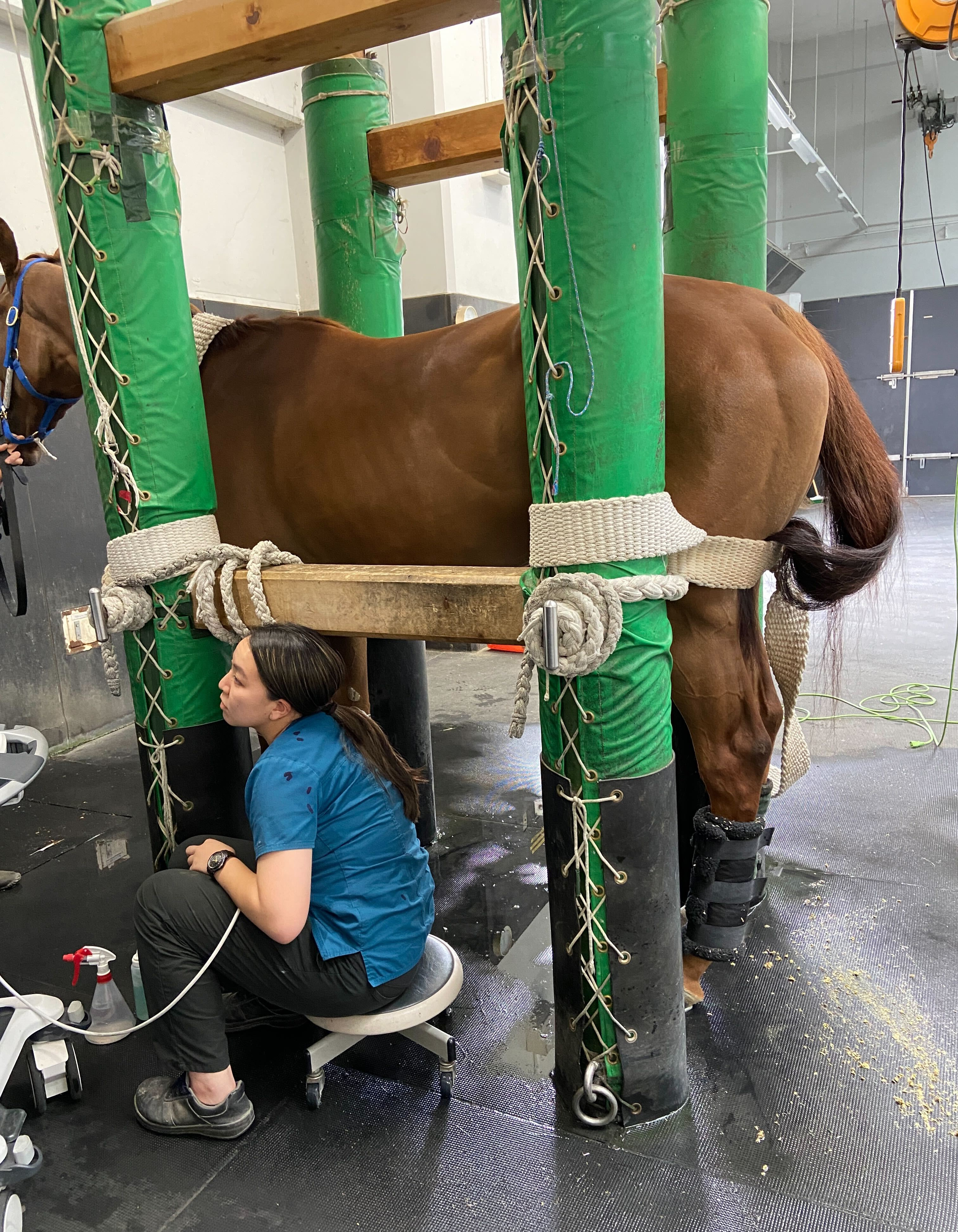 印象に特に残っているのは、入職すぐに参加した新規採用獣医職員専門研修で見学させていただいた第89回日本ダービーです。私は乗馬をきっかけに馬の獣医を目指したため、競馬の知識はほぼなく実際に競馬を見に行ったこともありませんでした。そのため今回が初めて見る中央競馬かつGⅠレースでした。日本ダービー当日は出走馬と共に装鞍所から発走地点まで帯同させていただき、肌身で競馬場の緊張感とどれだけの人がかかわっているか知ることができました。発走地点のすぐ隣で日本ダービーを見させていただいたのは競馬ファンの歓声も相まって迫力がとてもすごく、圧巻でした。誰もが夢見るこのような舞台にBTC利用馬が出走できるよう、診療と調査・研究を通して貢献したいと思った瞬間でした。
